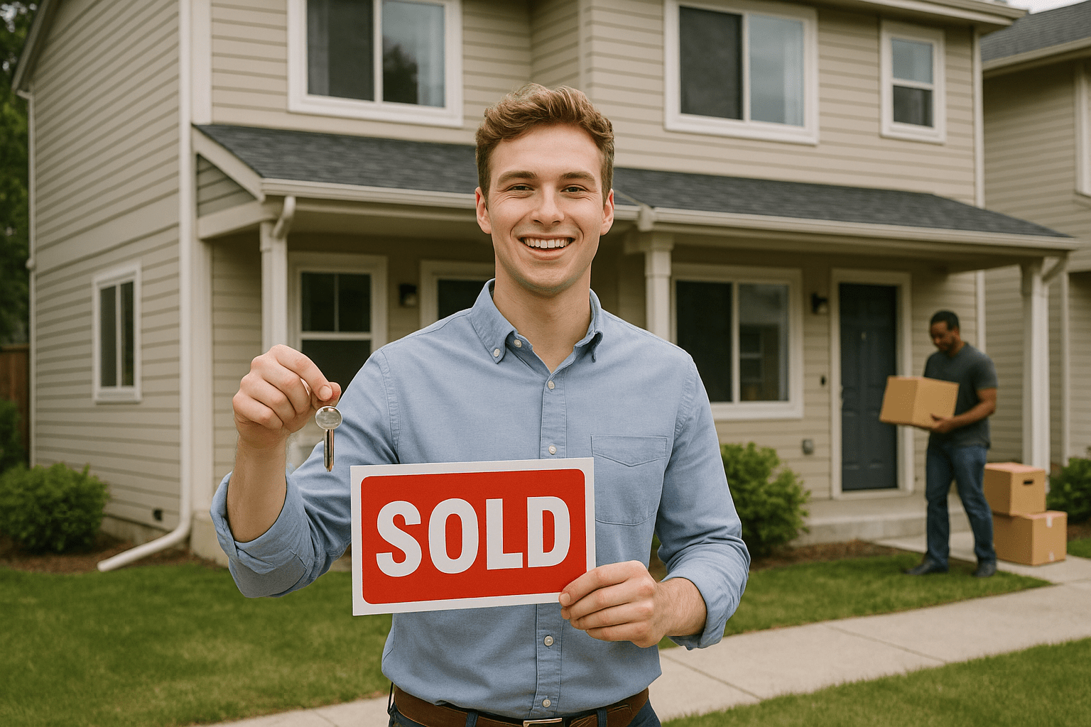 [IMAGE 4 PLACEHOLDER] Description: Young homeowner in mid-20s standing proudly in front of well-maintained duplex property, holding keys and “SOLD” sign, showing excitement and accomplishment, one rental unit visible with tenant moving boxes, residential neighborhood setting, capturing the moment of first investment property ownership
