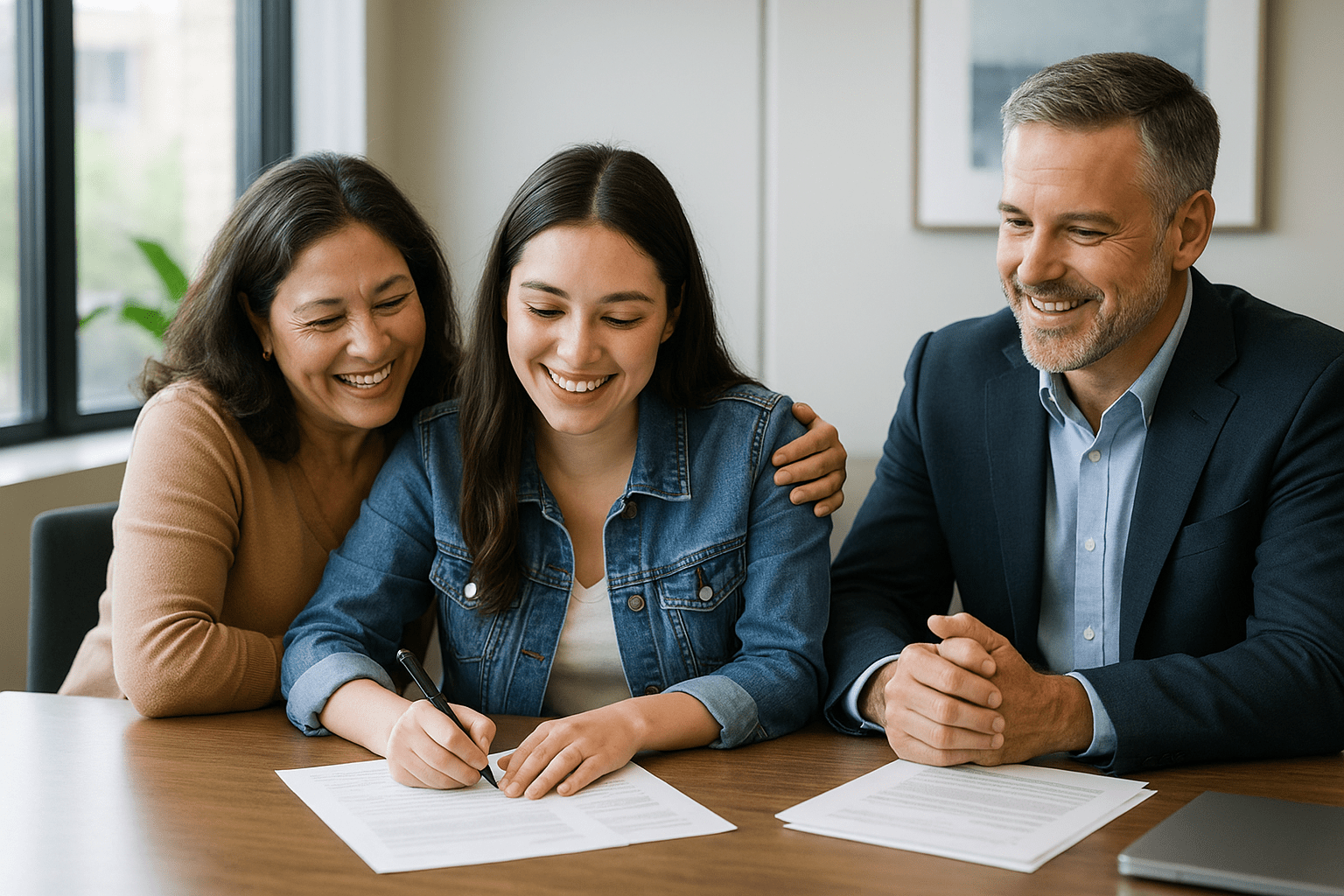 [IMAGE 5 PLACEHOLDER] Description: Multi-generational moment with parent and adult child in their 20s signing FHA loan documents together at closing table with loan officer, showing support and partnership, professional closing office, natural expressions of pride and excitement, capturing intergenerational wealth building
