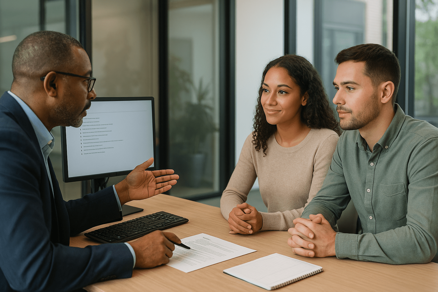 [IMAGE 2 PLACEHOLDER] Description: Mortgage advisor explaining FHA requirements to diverse young couple at desk, pointing to qualification checklist on computer screen, couple looking engaged and hopeful, modern mortgage office environment with professional but welcoming atmosphere, natural interaction captured