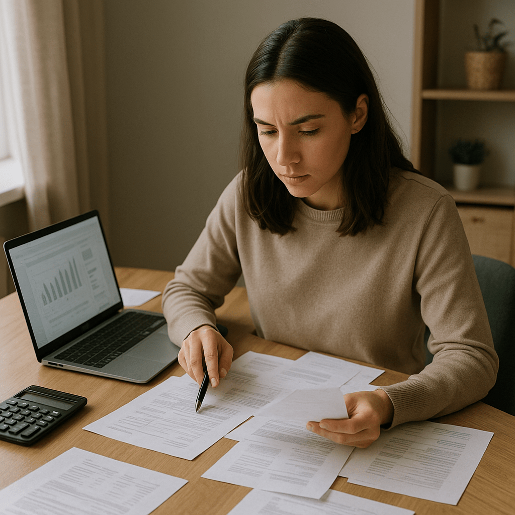 [IMAGE 3 PLACEHOLDER] Description: Young professional in their 20s sitting at home office desk reviewing financial documents and calculator, FHA qualification paperwork spread out, laptop showing mortgage calculator, concentrated expression, natural home lighting, authentic work-from-home setting showing financial planning process