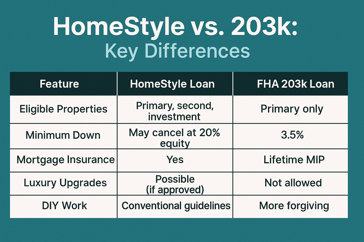 - The differences between HomeStyle Renovation and FHA 203(k) loans for renovation financing (HUD 203(k) rehabilitation mortgage insurance program)