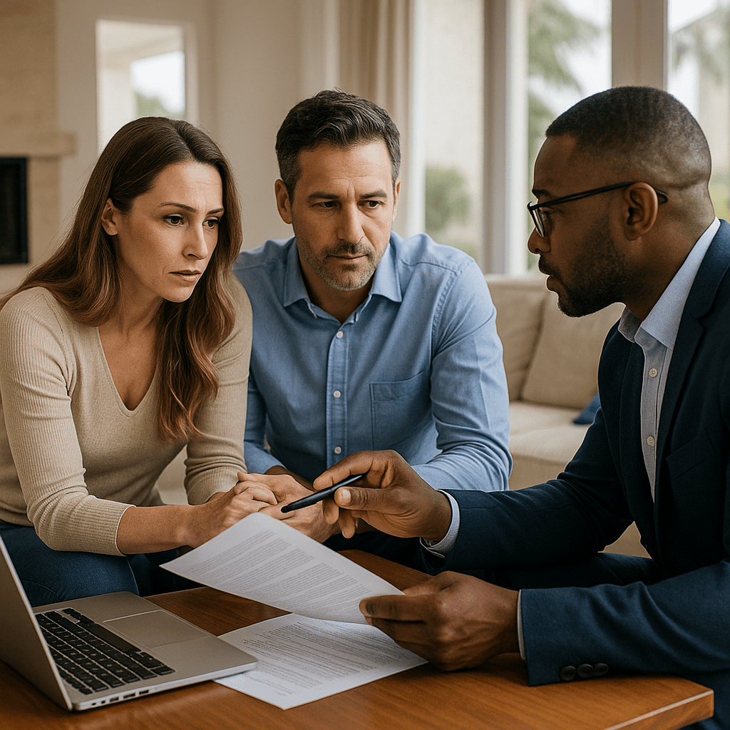 Divorcing parties should work with attorneys understanding real estate implications, engage mortgage professionals early about refinancing feasibility, obtain property valuations and loan payoff quotes, and understand tax implications of various division scenarios.